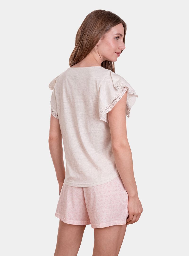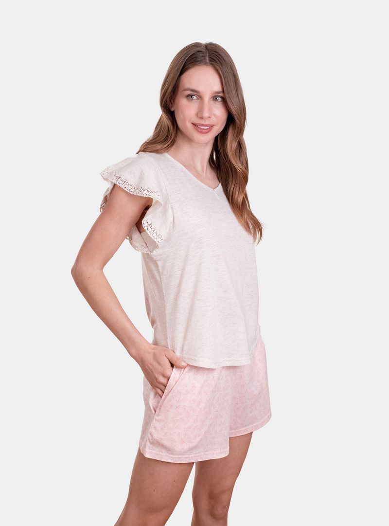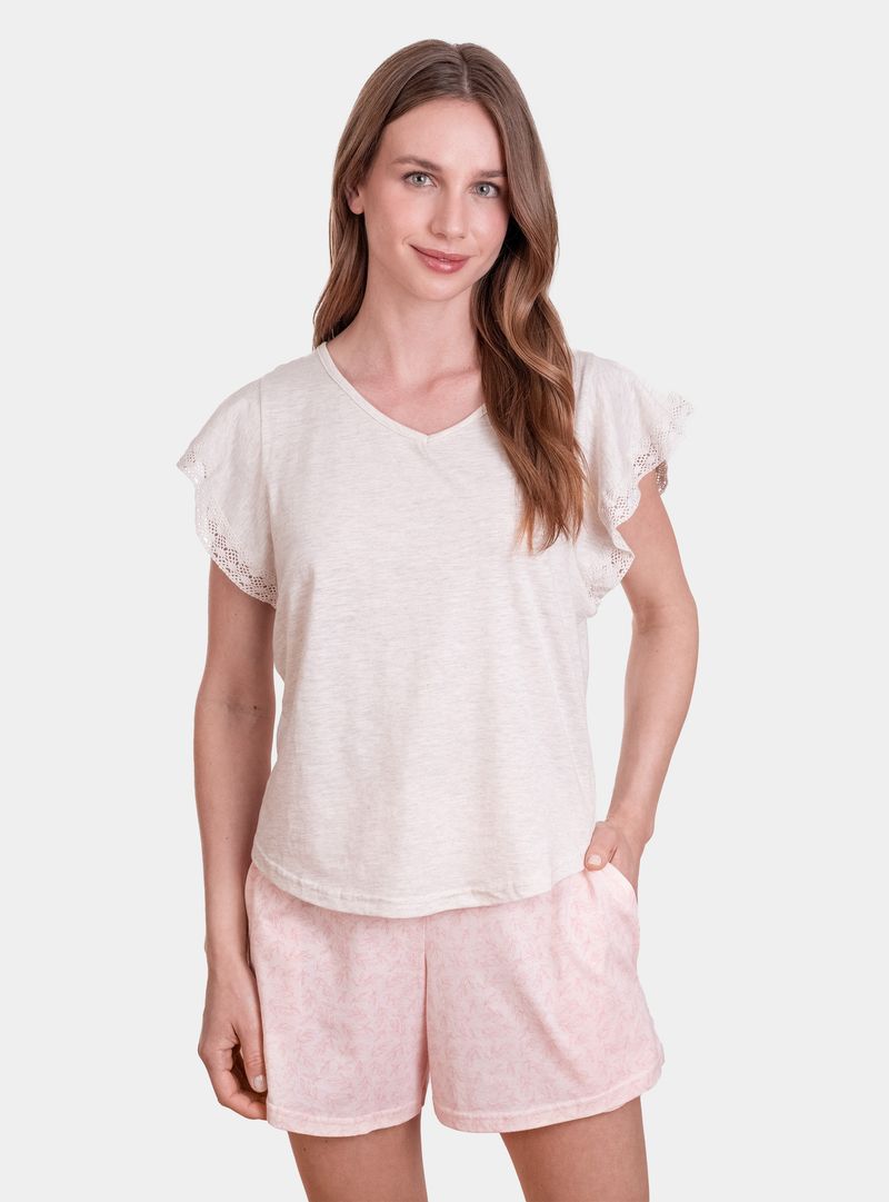 Pijama corto de algodón suave y respirable, ideal para el descanso. La polera de cuello en V destaca por sus mangas con blonda delicada, mientras el short liviano aporta libertad y comodidad, creando un look fresco y acogedor para dormir.