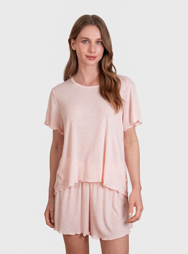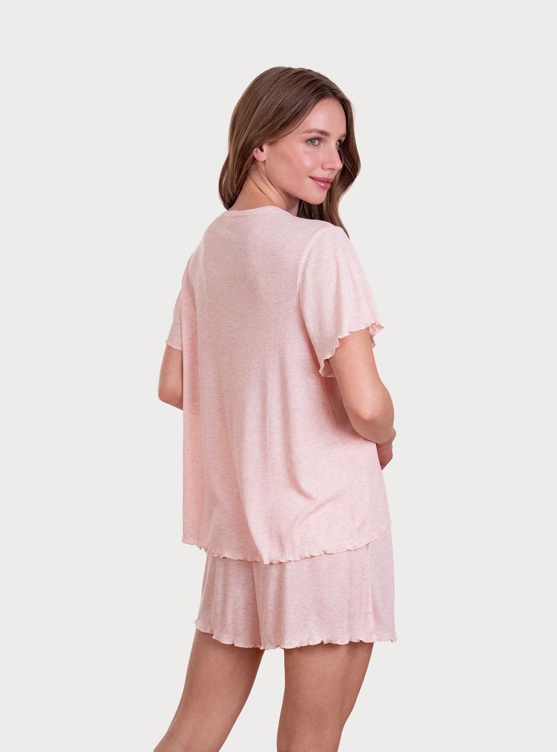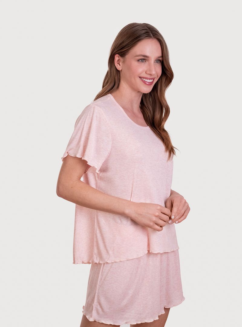 Pijama corto de textura rib suave y liviana, ideal para el descanso. Su polera de calce relajado con cuello redondo y mangas fluidas se combina con short cómodo, creando una sensación fresca, ligera y acogedora para dormir o estar en casa.